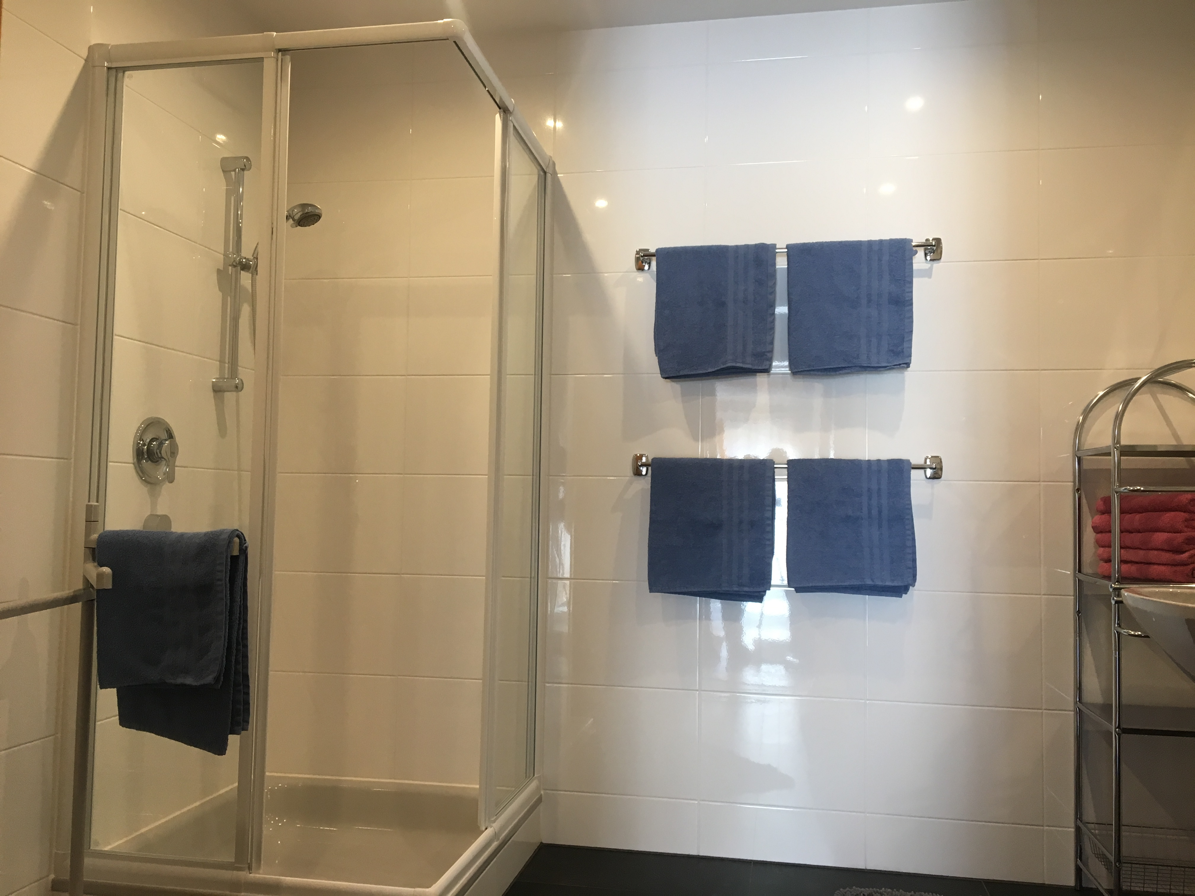 Das Bad ist mit einer Dusche und 2 Waschbecken ausgestattet. WC separat.